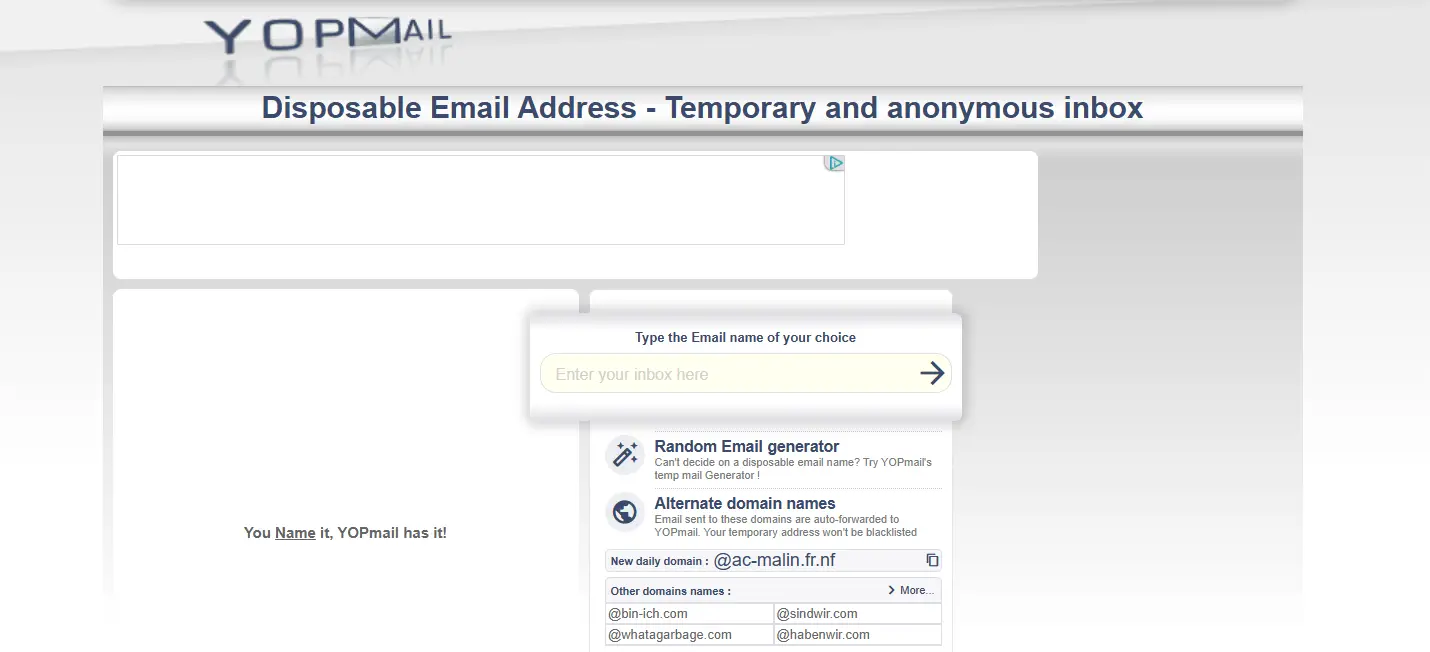 One standout feature is its use of alternate domain names—helpful when certain websites block common temp mail domains. Any emails sent to these alternate domains are automatically forwarded to your main YOPmail inbox.