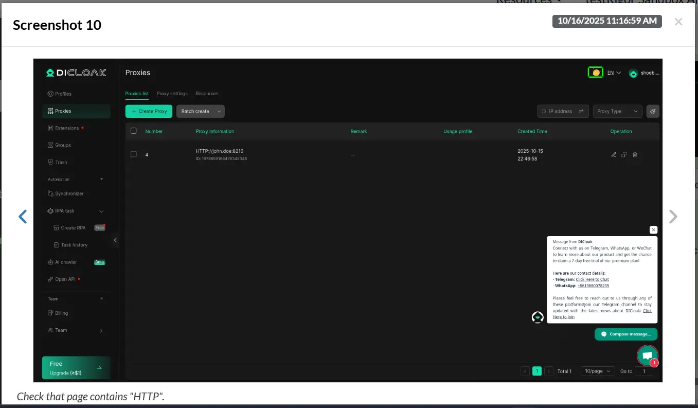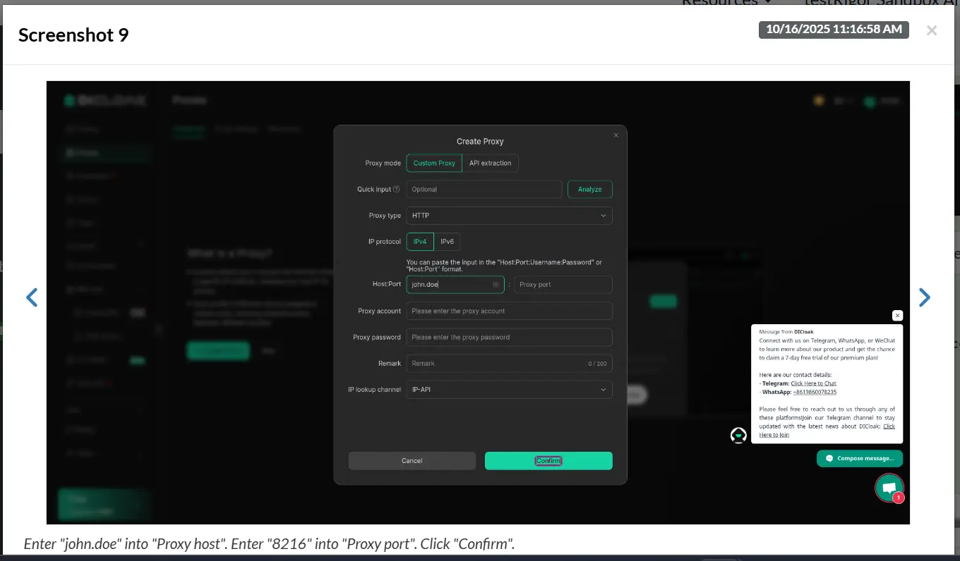 The above commands will log in to the Dicloak application and open the create proxy section, where the above details would be filled as follows: