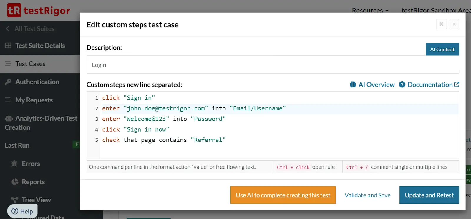E.g., below is the list of commands for the login method on Dicloak in a simulated environment in testRigor.