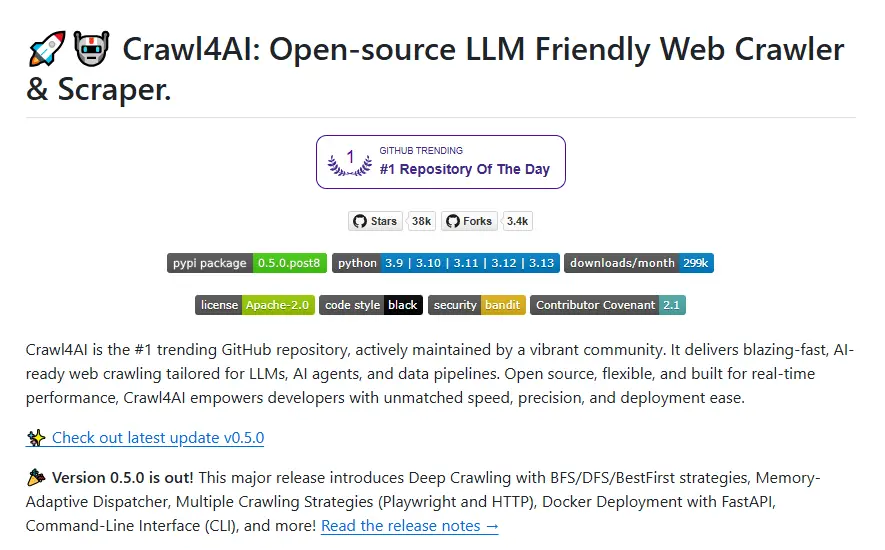 This is where Crawl4AI shines. It’s an open-source Web Scraper designed for today’s data needs—especially for AI and large language models. Unlike many other tools, Crawl4AI gives you clean, structured data in Markdown format. It also supports smart extraction using CSS, XPath, or even LLM-based logic. That means you get more useful data with less work.