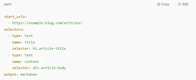 For example, let’s say you want to collect articles from a blog. You want the title and the content from each page. A simple config.yaml might look like this: