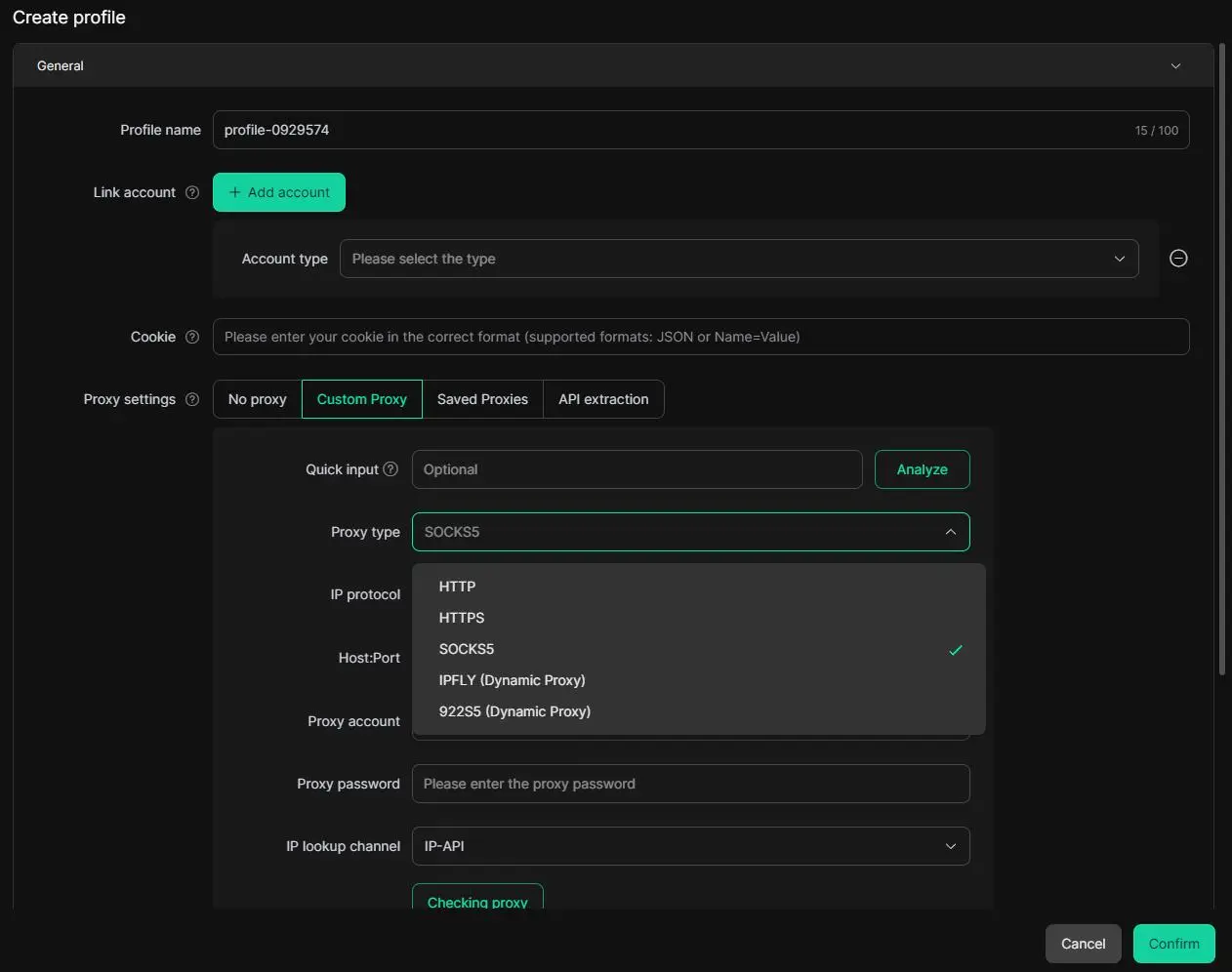 As shown in the settings, users can choose from various proxy types (such as SOCKS5) and assign unique proxies to each account, which can help prevent multiple accounts from using the same IP address, thereby minimizing the risk of detection.