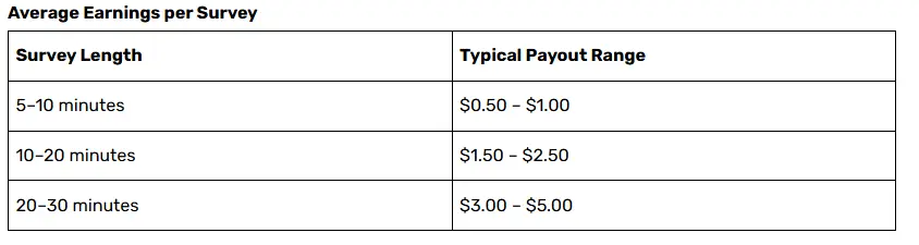 Survey Length vs. Payout: The amount you can earn from each survey depends on the length and complexity. On average, you can earn the following:
