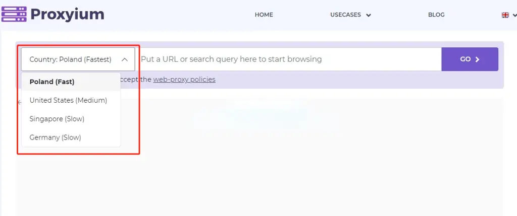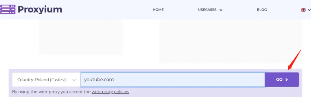 1.Go to Proxyium’s official website at proxyium.com. You might see some ads, so ignore those and look for the purple section where you can choose a country and enter a URL to begin browsing.