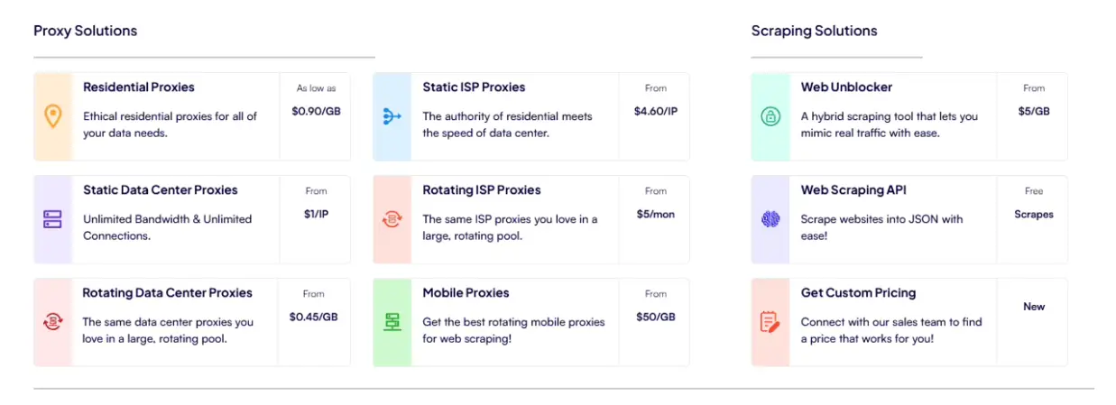 Residential Proxies: Over 100,000 ethically sourced IPs across 100+ countries, supporting city-level geo-targeting, sticky sessions, and dual authentication. Pricing starts at $0.90/GB .