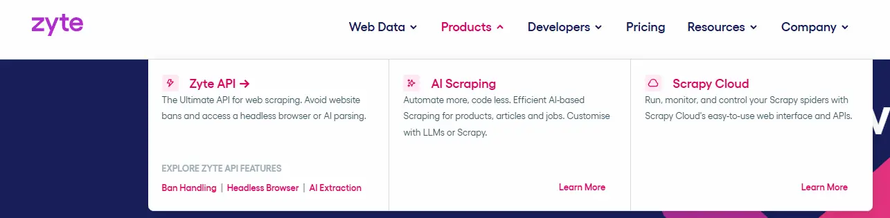 Zyte is suitable for businesses requiring advanced web scraping features and a fully managed proxy service.