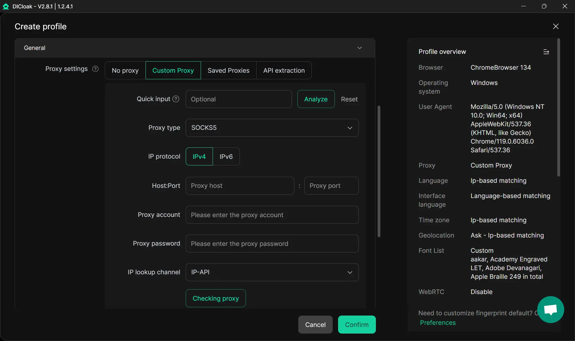 In the Create Profile window, specify name, account, cookies, etc., and opt for Custom Proxy, inserting Thordata proxy info into Host:Port (hostname:port:username:password)—it auto-resolves. Click Check Proxy — once approved, your IP will be verified. Then confirm to save the profile.