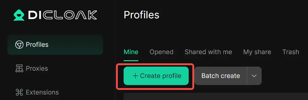 Start the DICloak client, authenticate, and proceed to Profile Management → Create Profile.