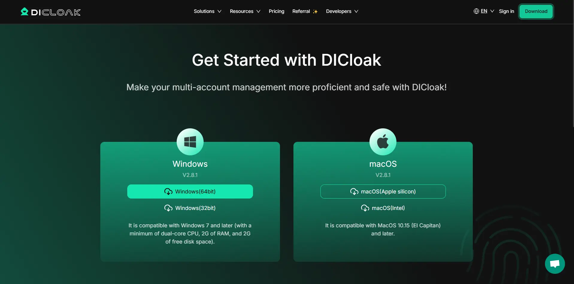 Go to DICloak’s official website and download the client that matches your operating system. This guide uses Windows as an example. Install the program and create an account to get started.
