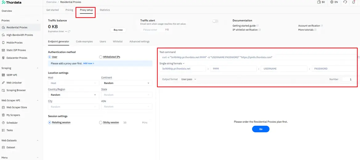Access Thordata's primary portal to enroll and sign in. Pick your preferred proxy category, decide on a package in the pricing area, and enroll. The illustration uses Rotating Residential Proxy, but comparable for others. Within Thordata's control panel, visit Users or Whitelist to form a proxy user or include your IP in the whitelist.