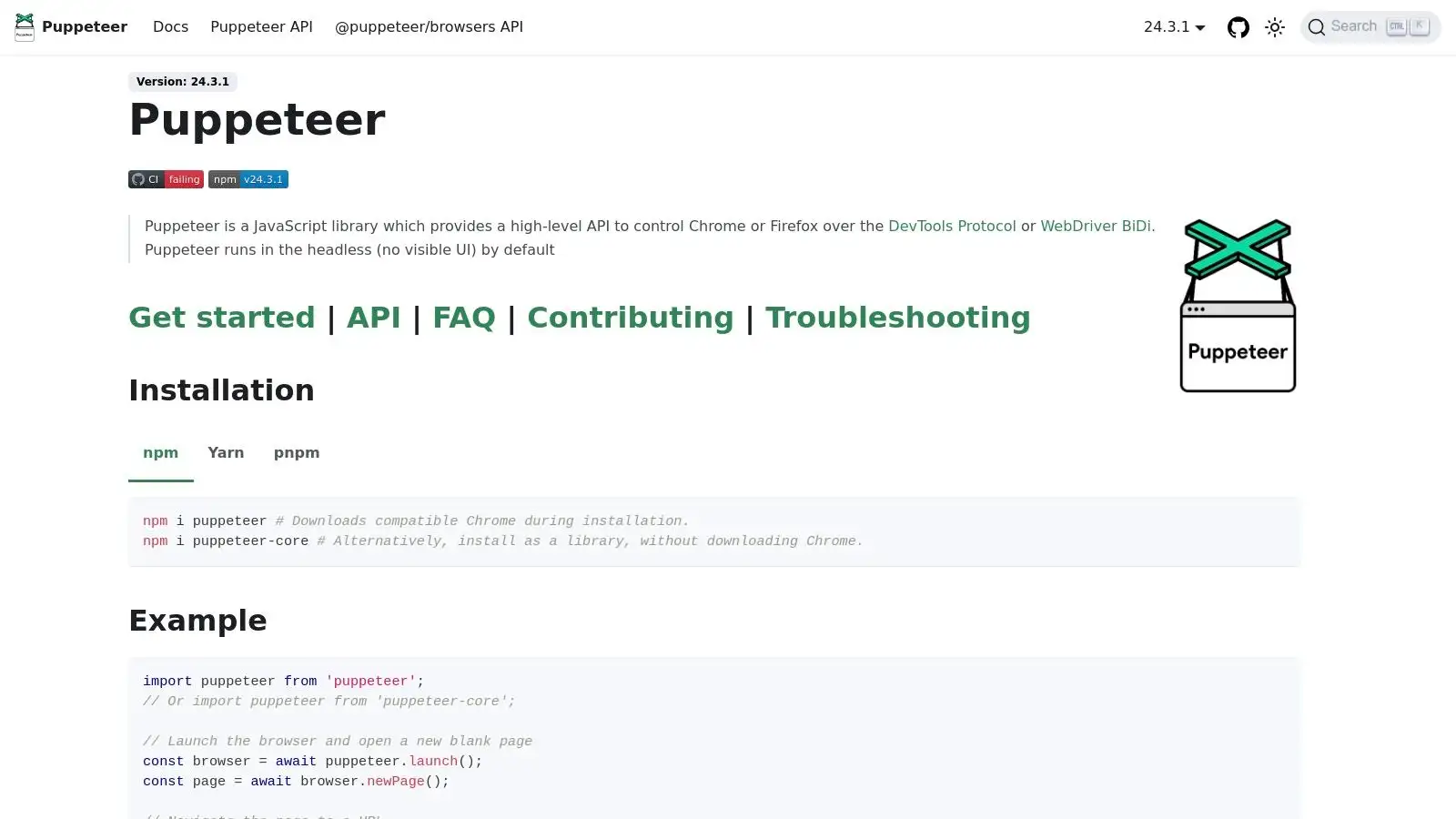 npm install puppeteer.Puppeteer is open-source and entirely free to use. The only prerequisites are Node.js and npm (Node Package Manager) installed on your system.