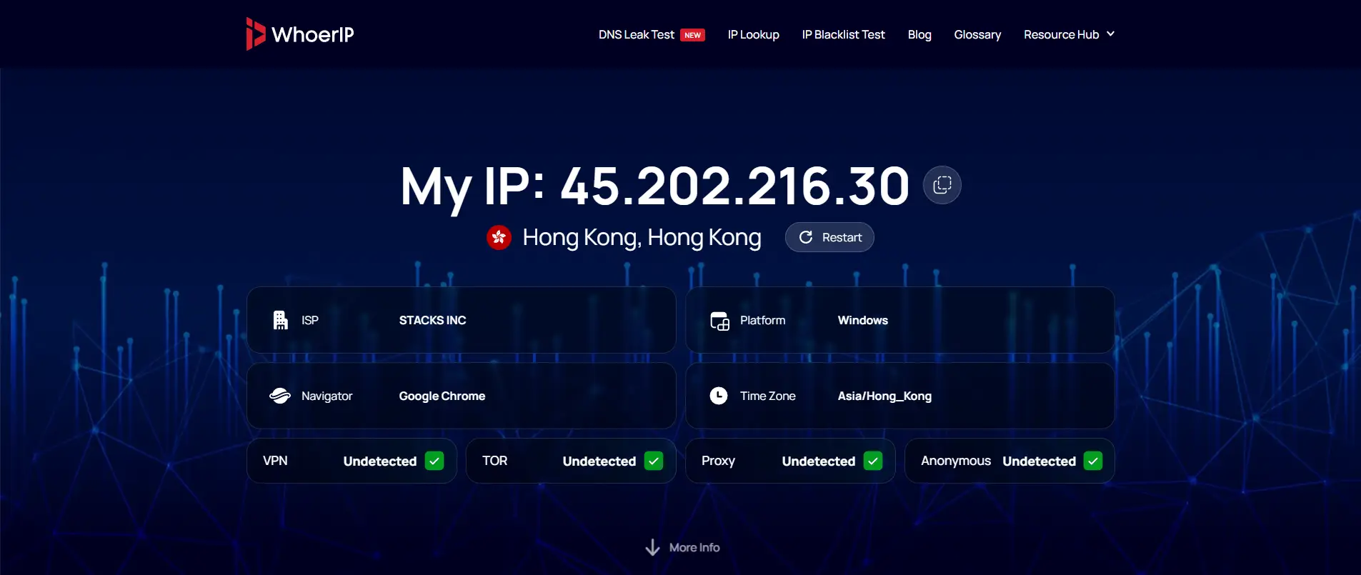 | Proxy / Tor Detection | Cross-checks your IP against known proxy or Tor lists. | Helps detect if your connection passes through a data center or masked route. |