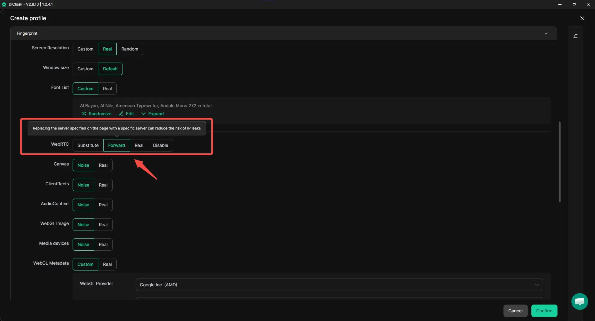 Um Risiken wie WebRTC-IP-Exposition und Proxy-Mismatches zu reduzieren, führt das neueste DICloak-Update die WebRTC-Weiterleitungsfunktion in den Browser-Fingerabdruckeinstellungen ein. Diese Funktion ermöglicht es WebRTC-Verkehr, dem im Browserprofil konfigurierten Proxy zu folgen, anstatt sich über das lokale Netzwerk zu verbinden.