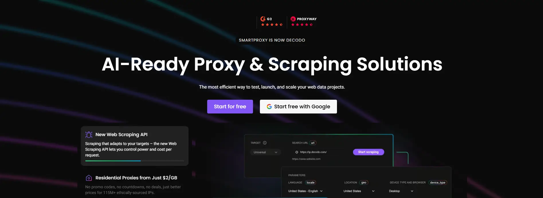 Smartproxy ha cambiado su nombre a Decodo, pero sigue siendo uno de los nombres más reconocibles de este grupo. Su página de Pakistán lista HTTP(S) y SOCKS5, rotación avanzada de proxy y sesiones fijas de hasta 24 horas, mientras que la página de rebranding destaca 125M+ IPs, 195+ ubicaciones y un 99,99% de tiempo de funcionamiento. Eso lo convierte en un proxy de pago sólido para Pakistán cuando quieres un proveedor convencional con una configuración sencilla. La pequeña desventaja es que el cambio de marca puede confundir a los usuarios que aún buscan el antiguo nombre Smartproxy.
