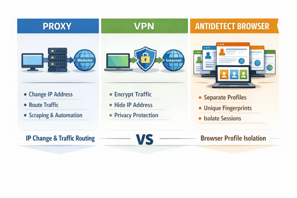 Ahí es donde empieza mucha confusión. Un proxy, una VPN y un navegador antidetección mejoran la privacidad de formas diferentes, pero resuelven problemas distintos. Si tu objetivo es la privacidad de navegación casual, una sola herramienta puede ser suficiente. Si tu objetivo es gestionar múltiples cuentas de forma más segura, reducir la vinculación de cuentas y evitar baneos innecesarios, necesitas entender la diferencia.
