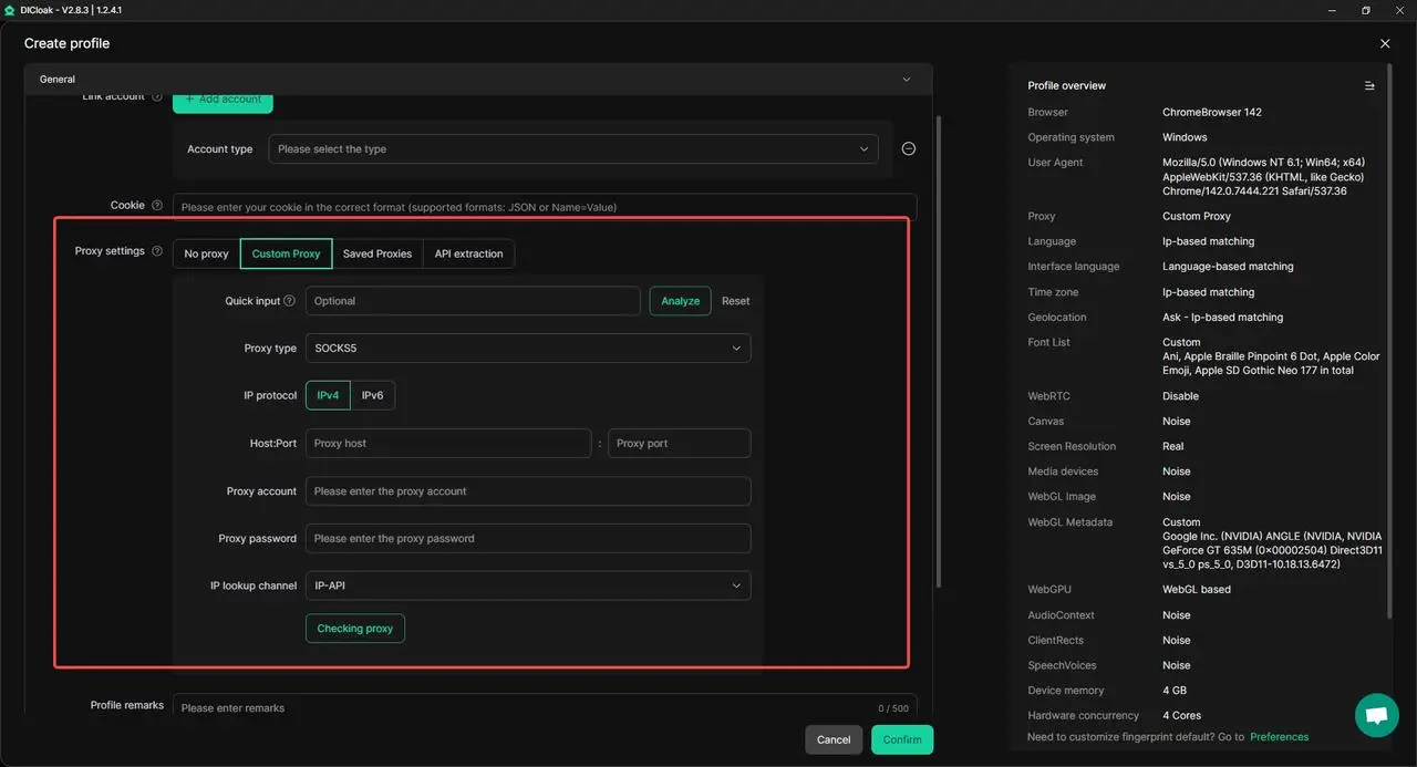 - Configurar la configuración del proxy: Asigna un proxy dedicado a cada perfil para que cada cuenta use una dirección IP separada. Esto ayuda a reducir los riesgos de asociación de cuentas durante las operaciones diarias.