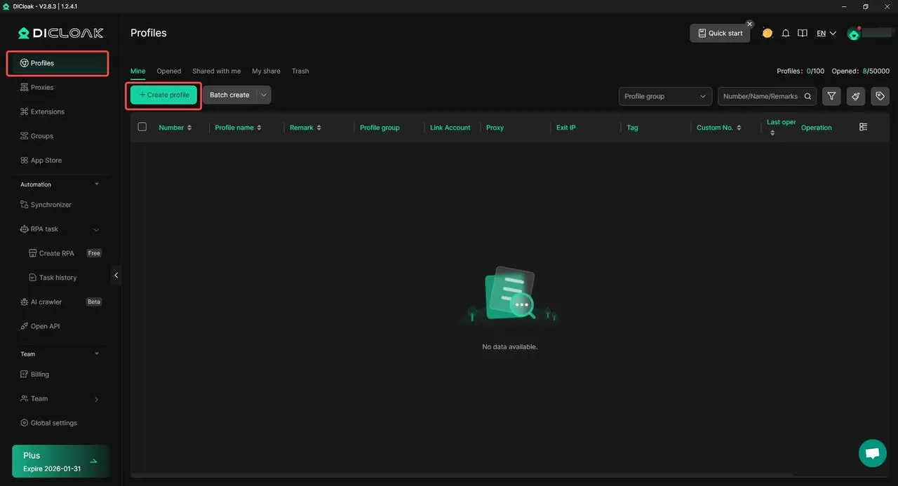 - Crea un nuevo perfil: Crea un nuevo perfil dentro de DICloak. Cada perfil es aislado y viene con sus propios parámetros configurables de dispositivo y perfil de navegador, permitiéndote gestionar cuentas de forma independiente.