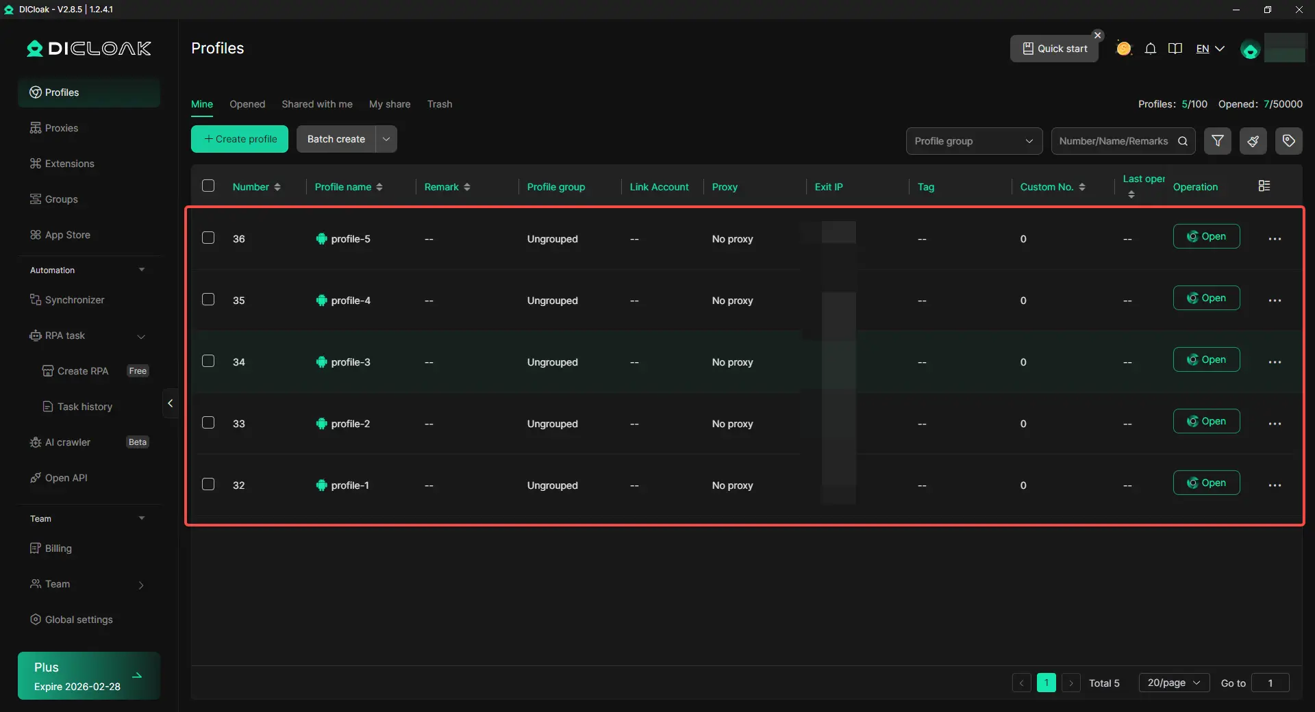 Consejo profesional: Al gestionar un gran número de cuentas, evita la configuración manual repetitiva. DICloak permite reutilizar configuraciones de perfiles, configuraciones de red y plantillas operativas, facilitando escalar desde unos pocos perfiles hasta decenas o incluso cientos con un comportamiento consistente entre entornos.