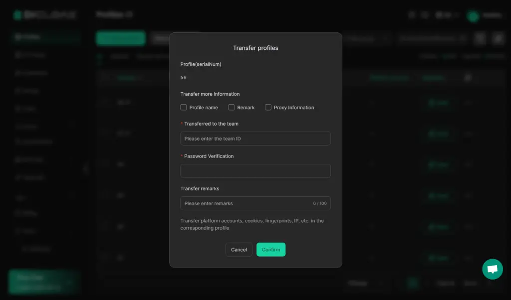 Quand le compte est prêt, le vendeur le met en vente. Pendant la transaction, le vendeur peut transférer directement ses profils vers un autre compte DICloak au sein de la plateforme DICloak. Il est également possible de transférer des profils de navigateur d’autres navigateurs vers DICloak. Le profil de navigateur anti-détection est ensuite remis au nouveau propriétaire avec le compte Facebook qui s’y trouve.
