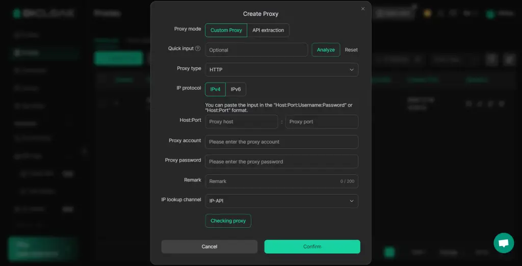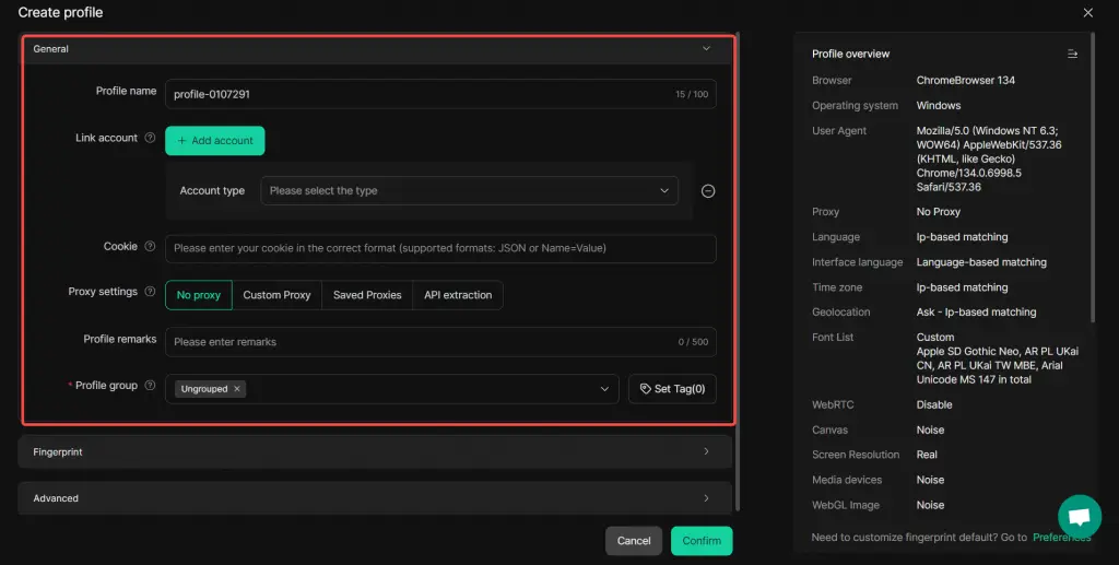 Chaque profil que vous créez a sa propre empreinte digitale. Pour que cela fonctionne parfaitement, vous devez créer votre propre proxy à partir de la bonne région. Mais DICloak ne fournit pas de proxys, donc vous devrez les acheter séparément et les configurer vous-même. Cela garantit que lorsque vous vous connectez à un compte Facebook acheté, vous avez l’impression d’utiliser un appareil complètement différent d’une ville spécifique.