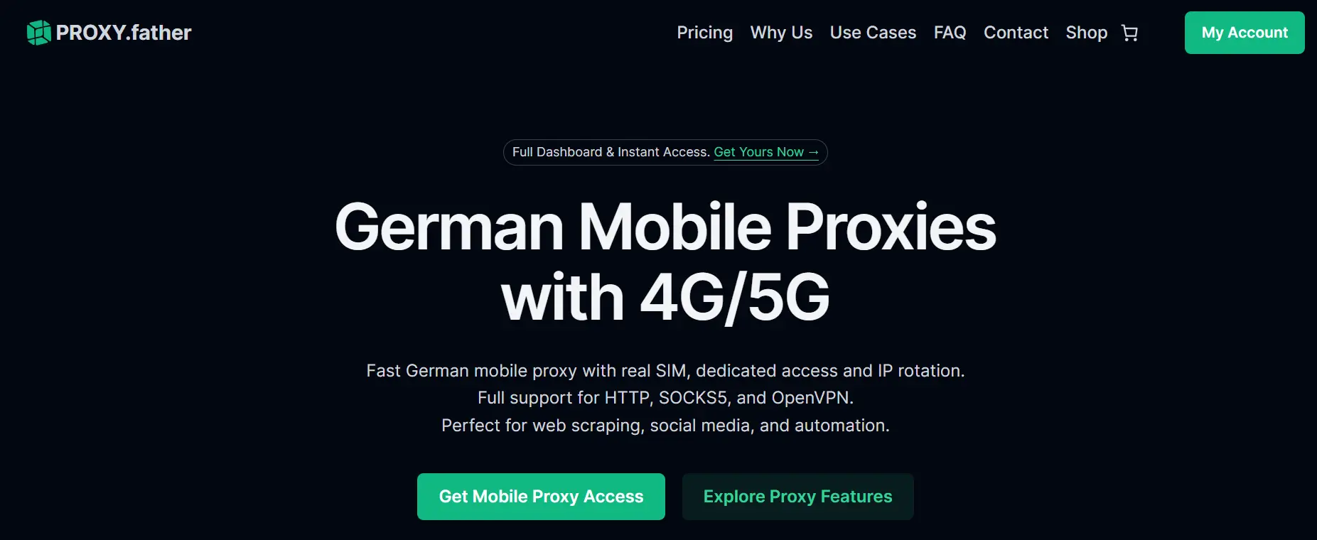 Pour les opérateurs ciblant le marché allemand, PROXY.father propose la référence : des proxys mobiles 4G/5G premium liés à de vraies cartes SIM allemandes, offrant une sécurité et une fiabilité maximales.