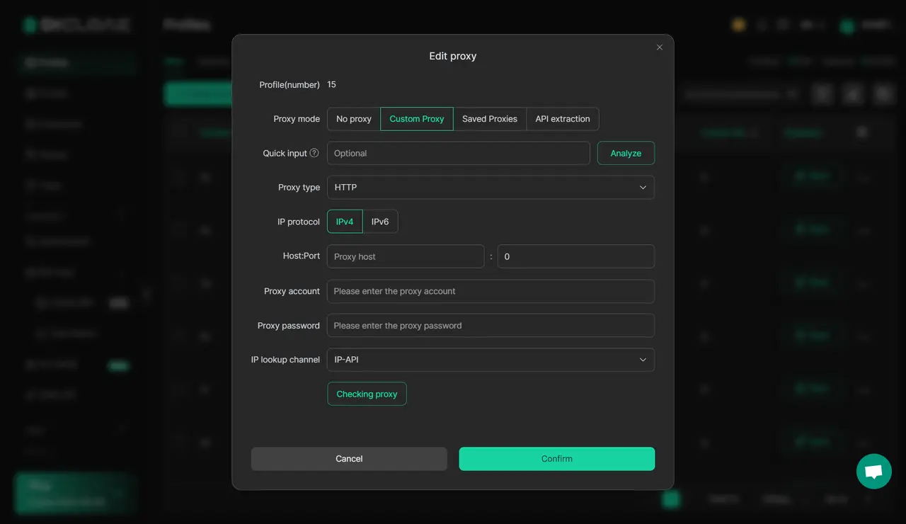 Pour éviter que votre IP ne soit bannie, utilisez des proxys résidentiels rotatifs compatibles avec OnlyFans. La configuration du profil de DICloak prend en charge l’intégration du proxy, ce qui vous permet de configurer de manière transparente différents proxys pour chaque session de navigation. Cela renforce votre anonymat et permet de contourner les mécanismes de détection IP, ce qui garantit la sécurité de vos activités de scraping.