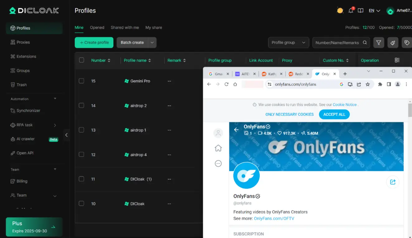 Étant donné qu’OnlyFans détecte activement le grattage automatisé, l’utilisation de la fonction Profil de navigation de DICloak vous permet de modifier votre empreinte numérique, y compris votre navigateur, votre système d’exploitation et les détails de votre appareil, pour apparaître comme un utilisateur légitime. Cela vous permet d’éviter d’être détecté et de garantir que vos activités ne sont pas détectées.