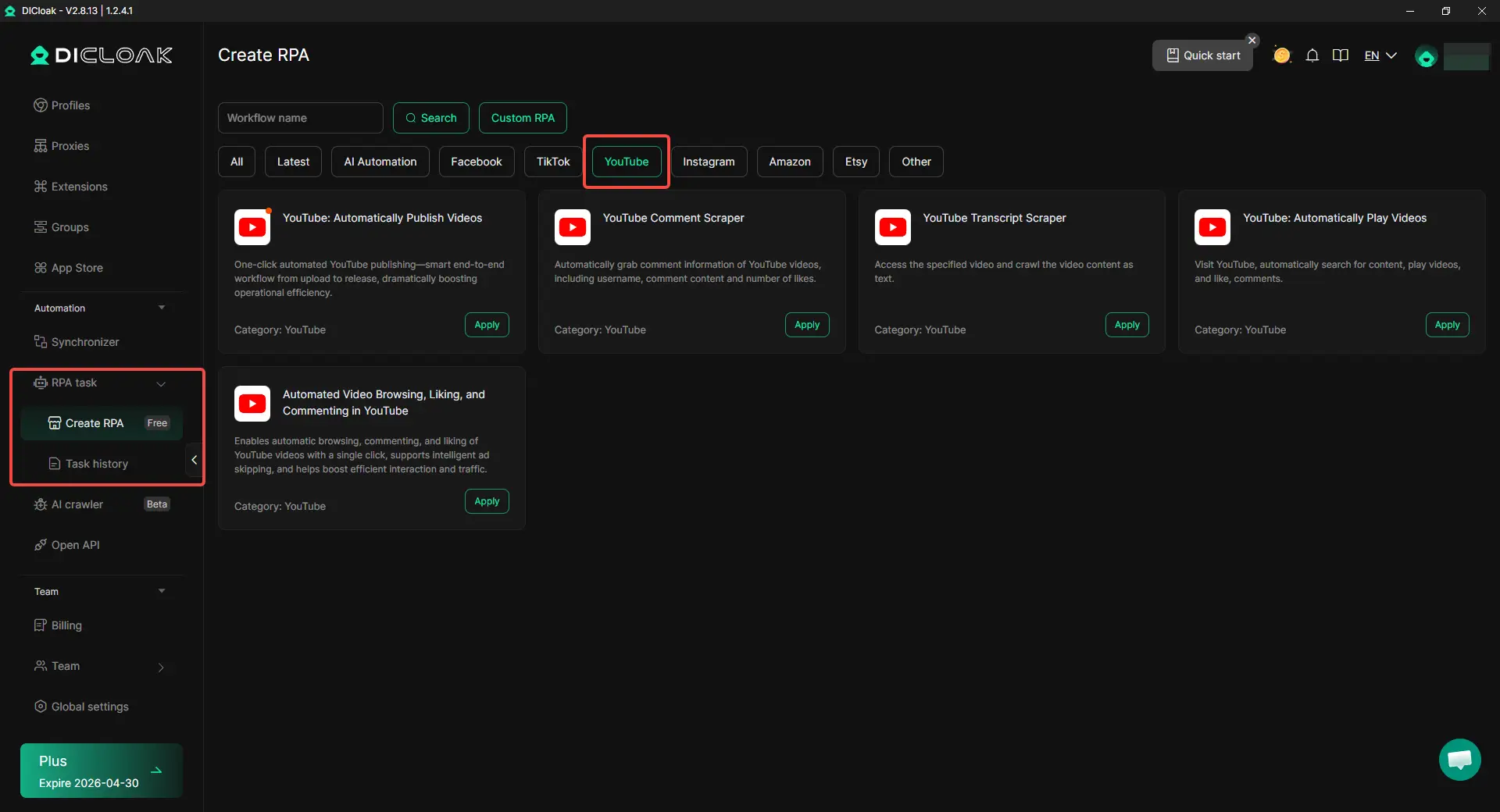 Pour les utilisateurs qui s’intéressent à un bot de commentaires YouTube, YouTube RPA offre une alternative pratique. Il peut automatiser la navigation, l’appréciation et les commentaires des vidéos dans un seul flux de travail, au lieu de gérer uniquement les commentaires. Cela le rend utile pour des tâches répétées sur YouTube qui nécessiteraient autrement beaucoup de clics manuels. Pour le travail multi-comptes, cela devient encore plus précieux. Les utilisateurs peuvent combiner RPA avec des profils de navigateur et des paramètres de proxy séparés, ce qui facilite l’exécution de tâches répétées sur plusieurs comptes tout en gardant chaque environnement de compte organisé et indépendant.