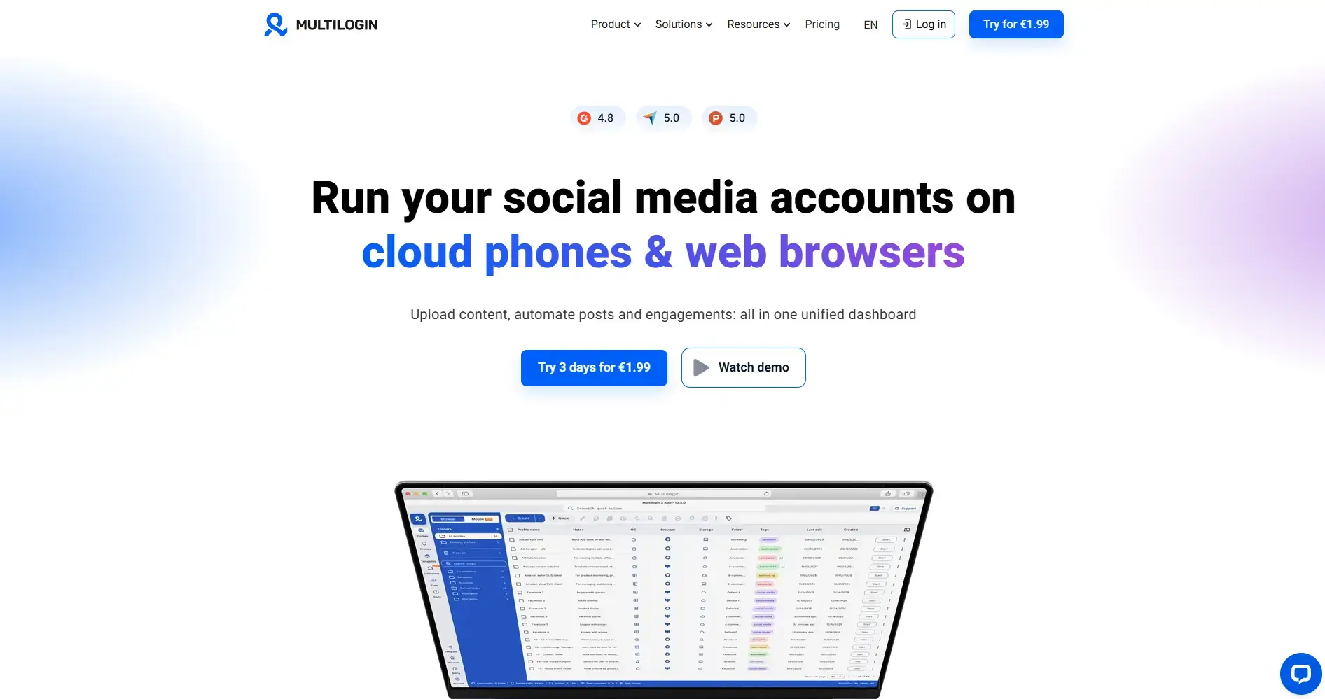 O GoLogin funciona principalmente através de navegadores na cloud, eliminando a necessidade de instalação local de software e reduzindo os requisitos de hardware. Os perfis móveis funcionam particularmente bem para Instagram, TikTok e outras plataformas mobile-first – algo com que as soluções exclusivas para desktop têm dificuldades.