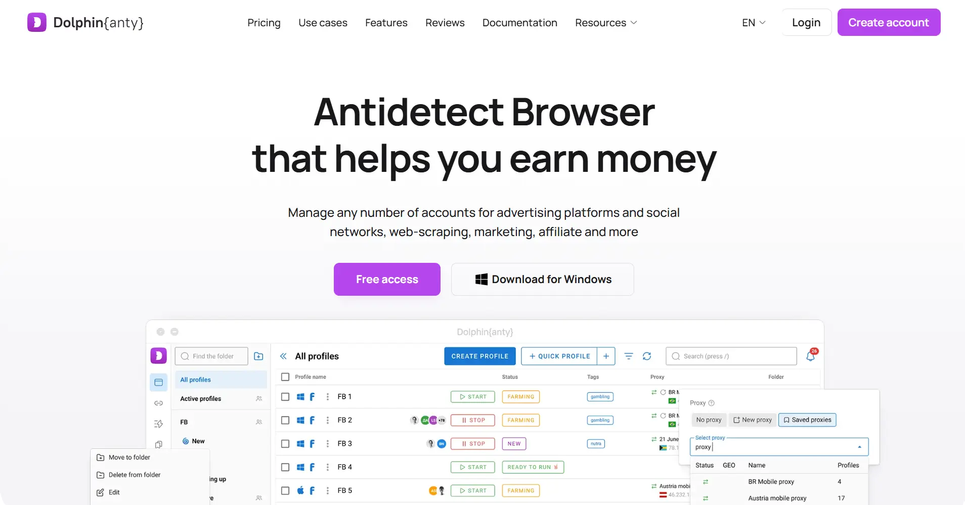 A Dolphin Anty construiu a sua plataforma especificamente para profissionais de marketing nas redes sociais, com especial destaque na gestão de contas do Facebook e TikTok. O seu construtor de automação visual permite aos utilizadores criar fluxos de trabalho clicando em ações em vez de escrevendo código.