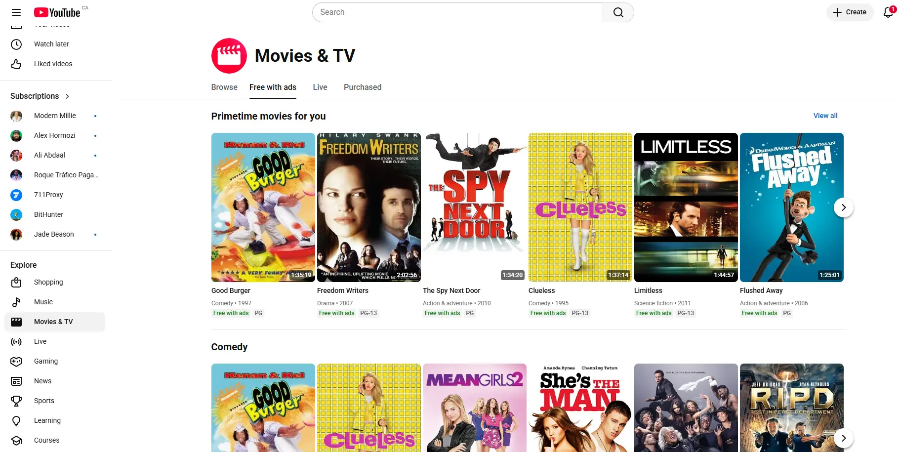 O YouTube oferece uma secção de filmes "Grátis com anúncios" e muitos filmes completos em inglês provenientes de canais licenciados. Filmes antigos de Hollywood, documentários e títulos independentes são comuns. Os utilizadores normalmente procuram por "filmes gratuitos" e verificam se o utilizador é um canal oficial. Legendas e suporte amplo para dispositivos tornam o YouTube fácil para iniciantes.