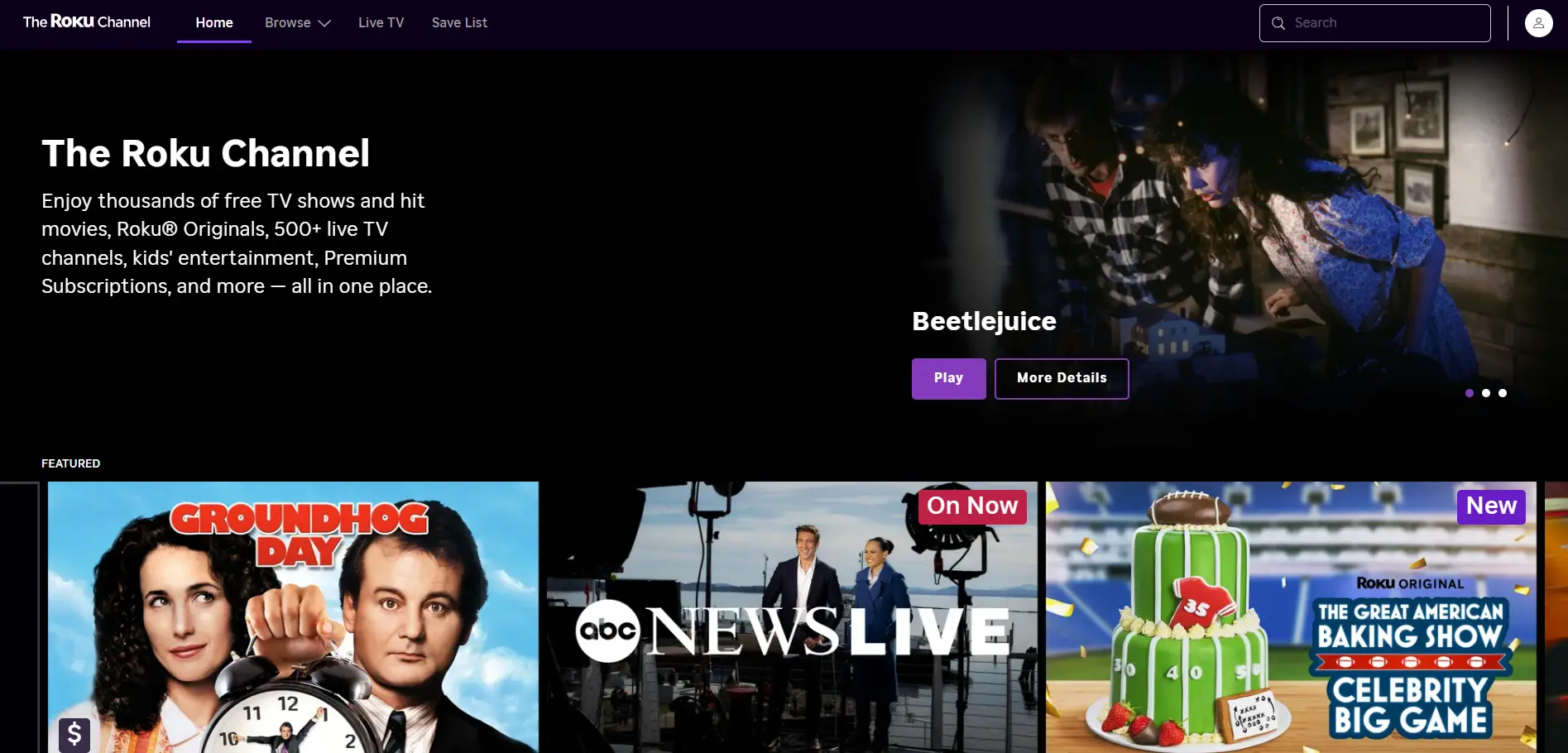 O Roku Channel oferece uma grande coleção de filmes em inglês gratuitos e canais em direto. Os utilizadores podem ver em dispositivos Roku, aplicações ou navegadores em várias regiões. É uma opção popular para acesso rápido sem subscrições.