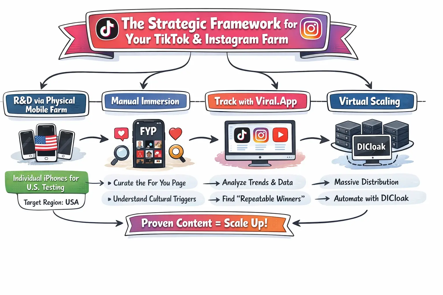 Construir hoje uma quinta bem-sucedida no TikTok e Instagram requer uma abordagem híbrida. Não se pode simplesmente automatizar desde o primeiro dia. É necessário uma combinação de testes físicos de dispositivos e gestão virtual avançada para contornar os sofisticados sistemas de deteção usados pela ByteDance e Meta. Se quiser escalar de forma eficaz e segura, siga este plano.