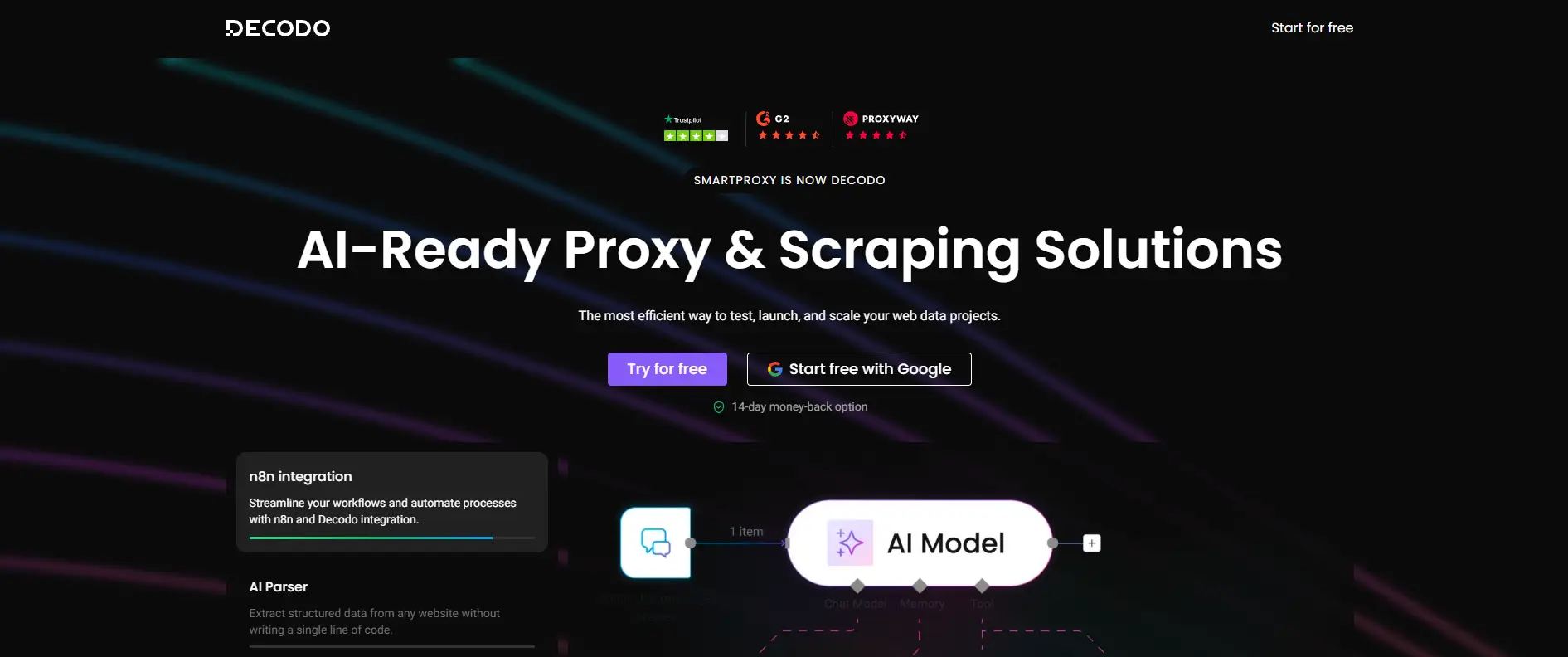 2. Decodo (anteriormente Smartproxy) A Decodo oferece um grande grupo de proxy e um desempenho forte a um preço mais acessível. São frequentemente recomendados para projetos de SEO de pequeno a médio porte. Os seus painéis de controlo e planos flexíveis ajudam iniciantes e equipas a gerir proxies facilmente.