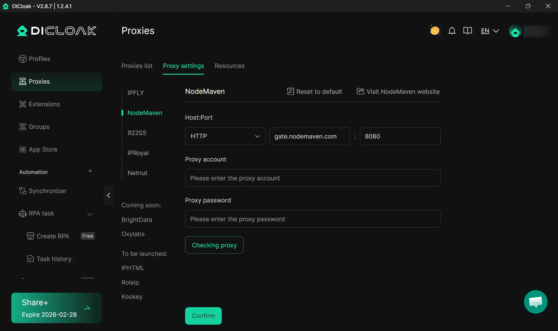現已完整整合NodeMaven的動態代理功能。使用者選擇此服務供應商時,可事先預設代理詳細設定。