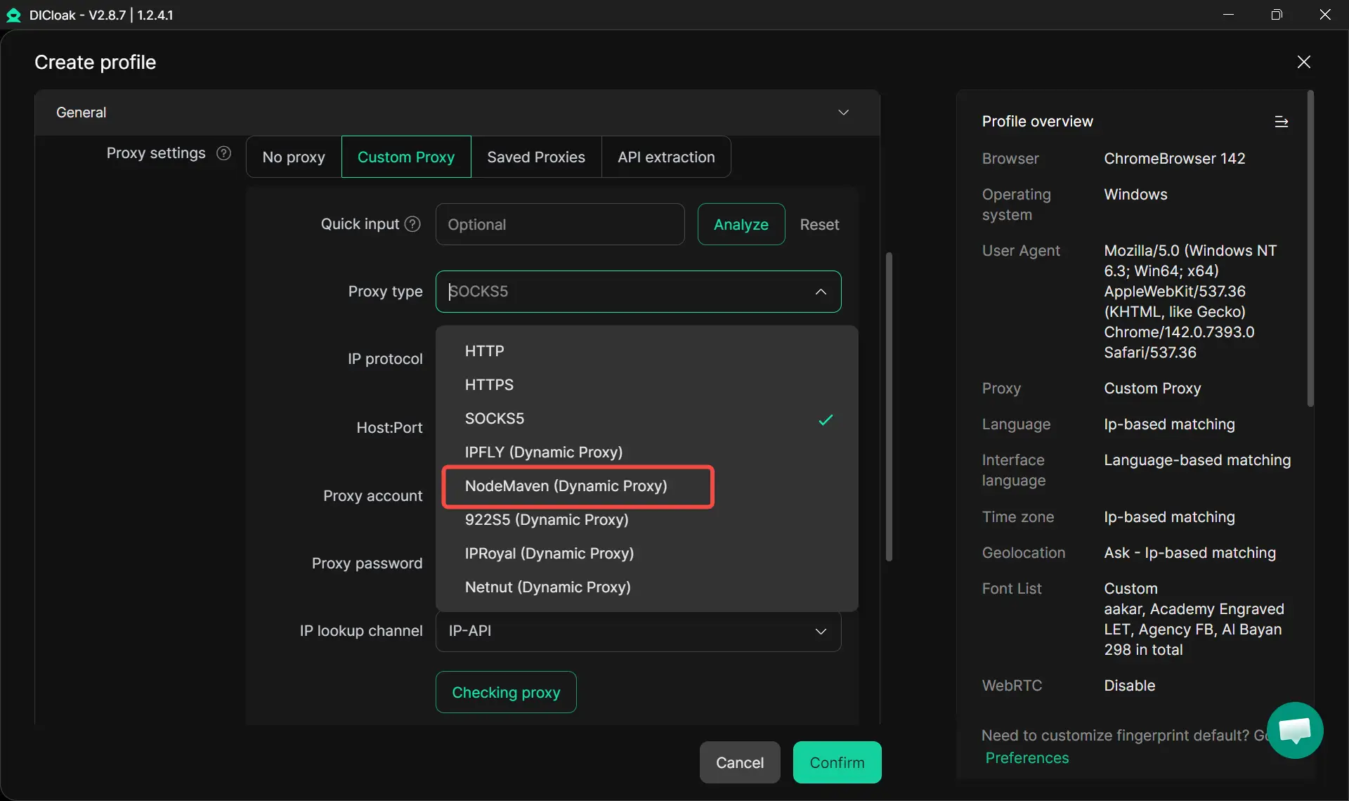 建立新的瀏覽器設定檔時,只需在 Proxy 類型中選擇 NodeMaven,您的設定就會自動套用。這讓 Proxy 設定變得更快、更流暢且幾乎毫不費力——非常適合用來管理多個帳號,無須手動設定。