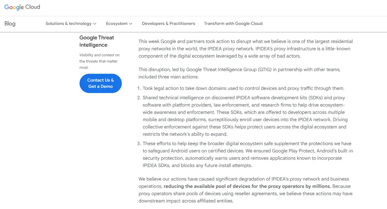 在一項重大執法行動中,Google 與行業合作夥伴合作,於 2026 年 1 月 29 日宣布對 IPidea 網絡進行重大打擊。IPidea 是一個大規模的住宅代理網絡,自稱是全球領先的提供商,擁有數百萬可用 IP 地址。關鍵的是,消息來源顯示 IPidea 並非單一實體,而是眾多其他知名代理品牌背後的控制力量,包括360 Proxy、922 Proxy、Luna Proxy和PIA S5 Proxy。