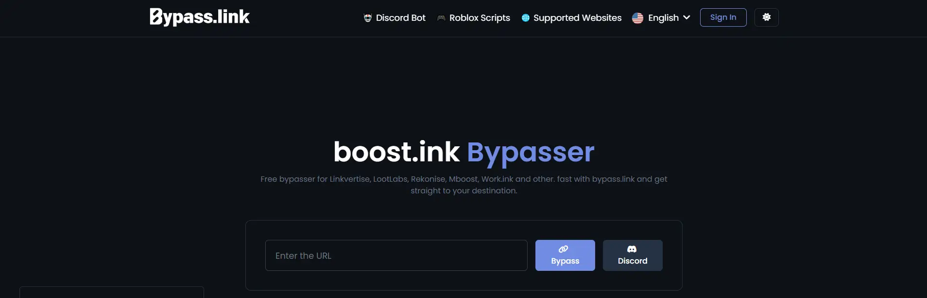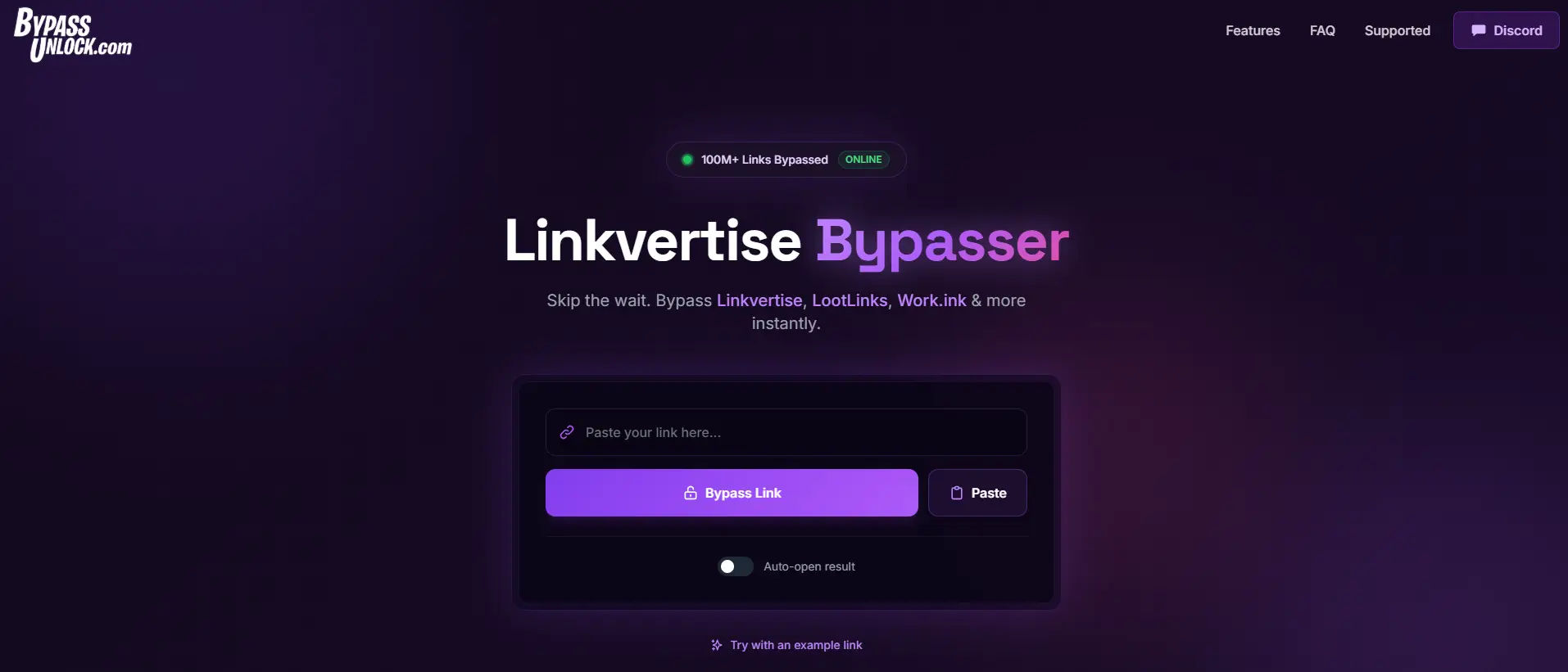 BypassUnlock.com是另一個基於瀏覽器的服務,專注於跳過Linkvertise及數個相關廣告連結平台。它將自身定位為一款只需使用者極少互動,就能跳過等待步驟的工具。