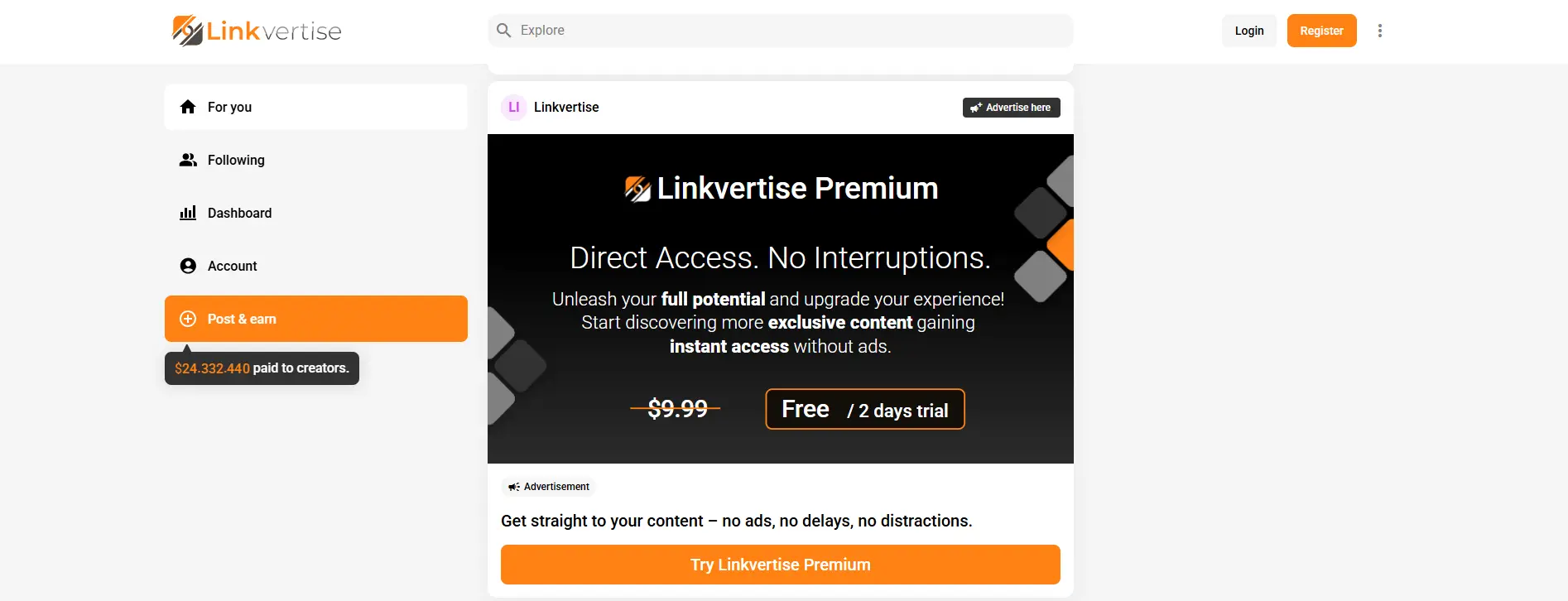 Quyền truy cập trả phí hoạt động theo cách khác. Linkvertise cao cấp không phải là một điển hình Linkvertise Bypasser. Đây là tùy chọn không có quảng cáo chính thức bên trong nền tảng. Nó ít hấp dẫn hơn đối với người dùng đang tìm kiếm một phím tắt miễn phí, nhưng nó rõ ràng hơn nhiều về độ tin cậy và hành vi mong đợi. Nói một cách đơn giản, miễn phí Đội trưởng Linkvertise Các công cụ tập trung vào sự tiện lợi, trong khi quyền truy cập trả phí tập trung nhiều hơn vào tính ổn định.