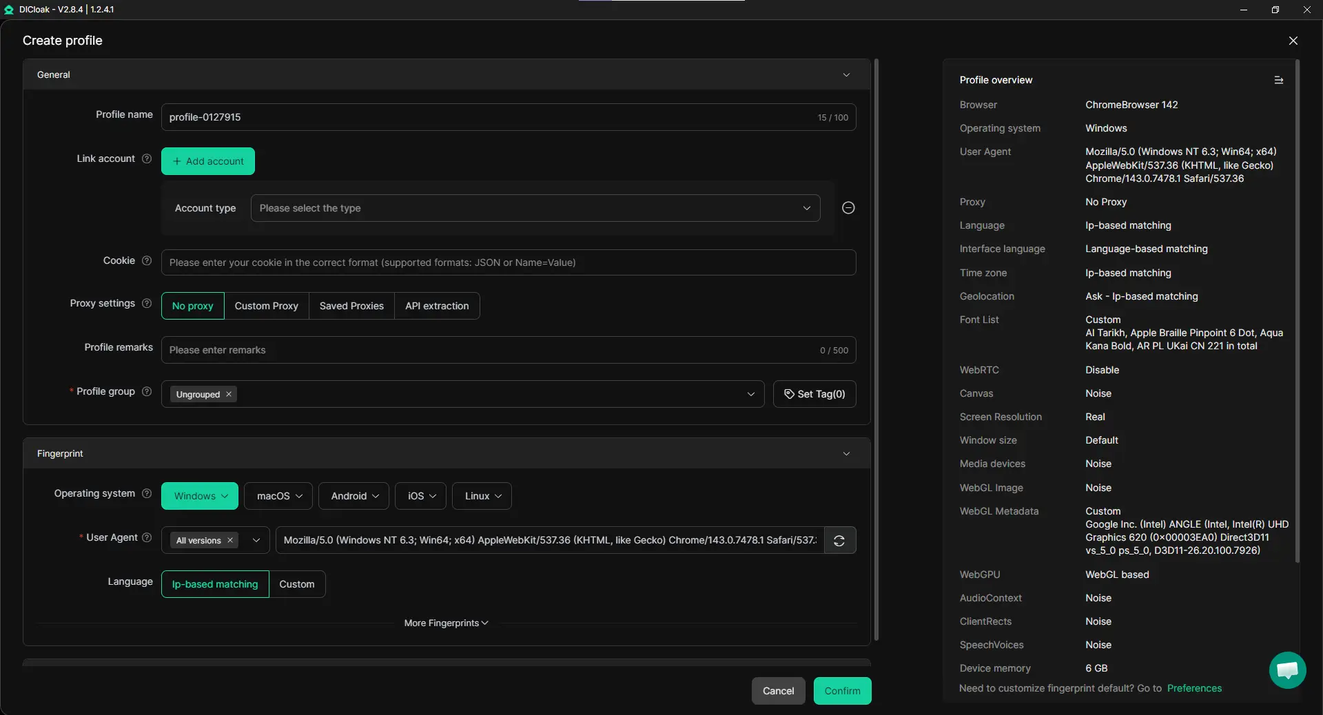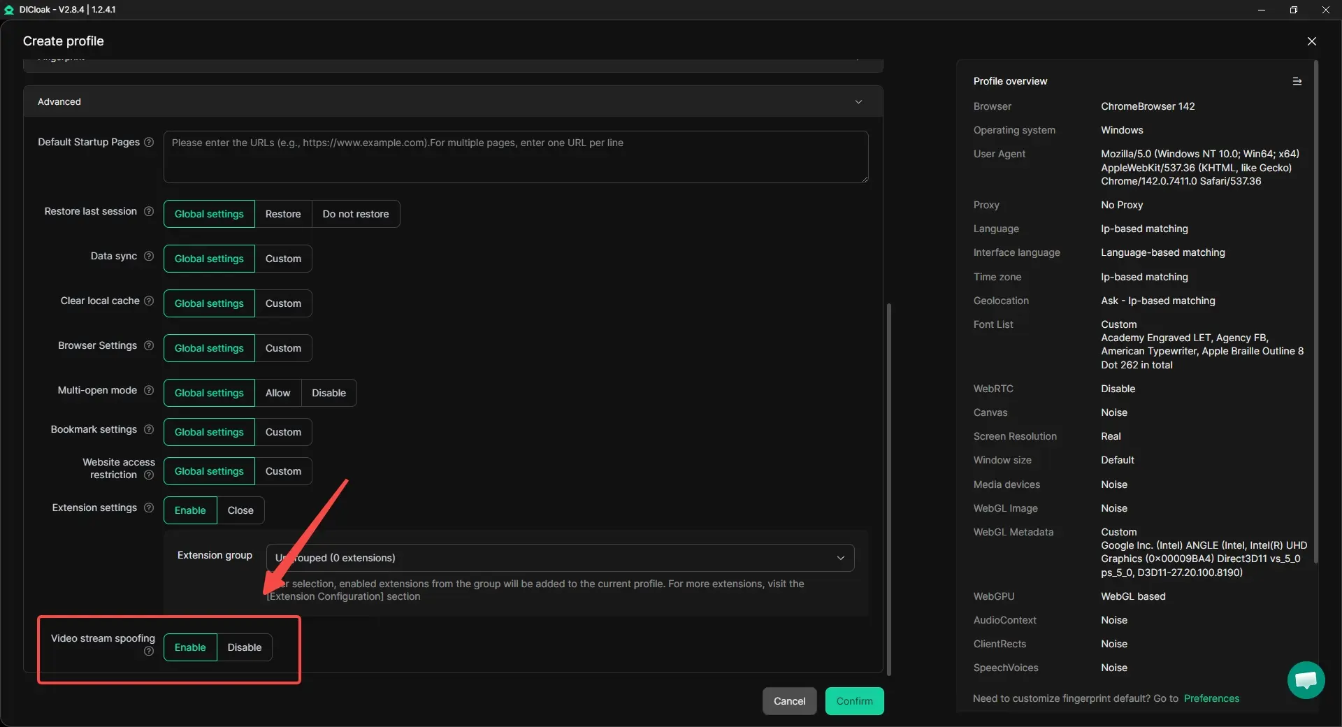 Tính năng này có thể được bật trong Cài Đặt Hồ Sơ Nâng Cao trong DICloak. Nó đảm bảo dấu vân tay thiết bị nhất quán, cho phép nhà tiếp thị và đội nhóm quản lý nhiều tài khoản mượt mà và mở rộng nội dung được kiếm tiền mà không bị gián đoạn.
