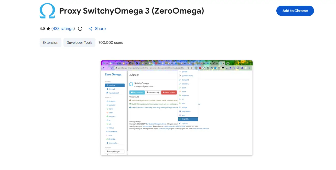 Các bản cập nhật gần đây đối với các phiên bản kê khai của trình duyệt đã khiến một số người dùng thấy tiện ích mở rộng cũ bị vô hiệu hóa trong cửa hàng trực tuyến của họ. Nếu bạn gặp phải điều này, giải pháp là chuyển sang Proxy SwitchyOmega 3 (ZeroOmega).