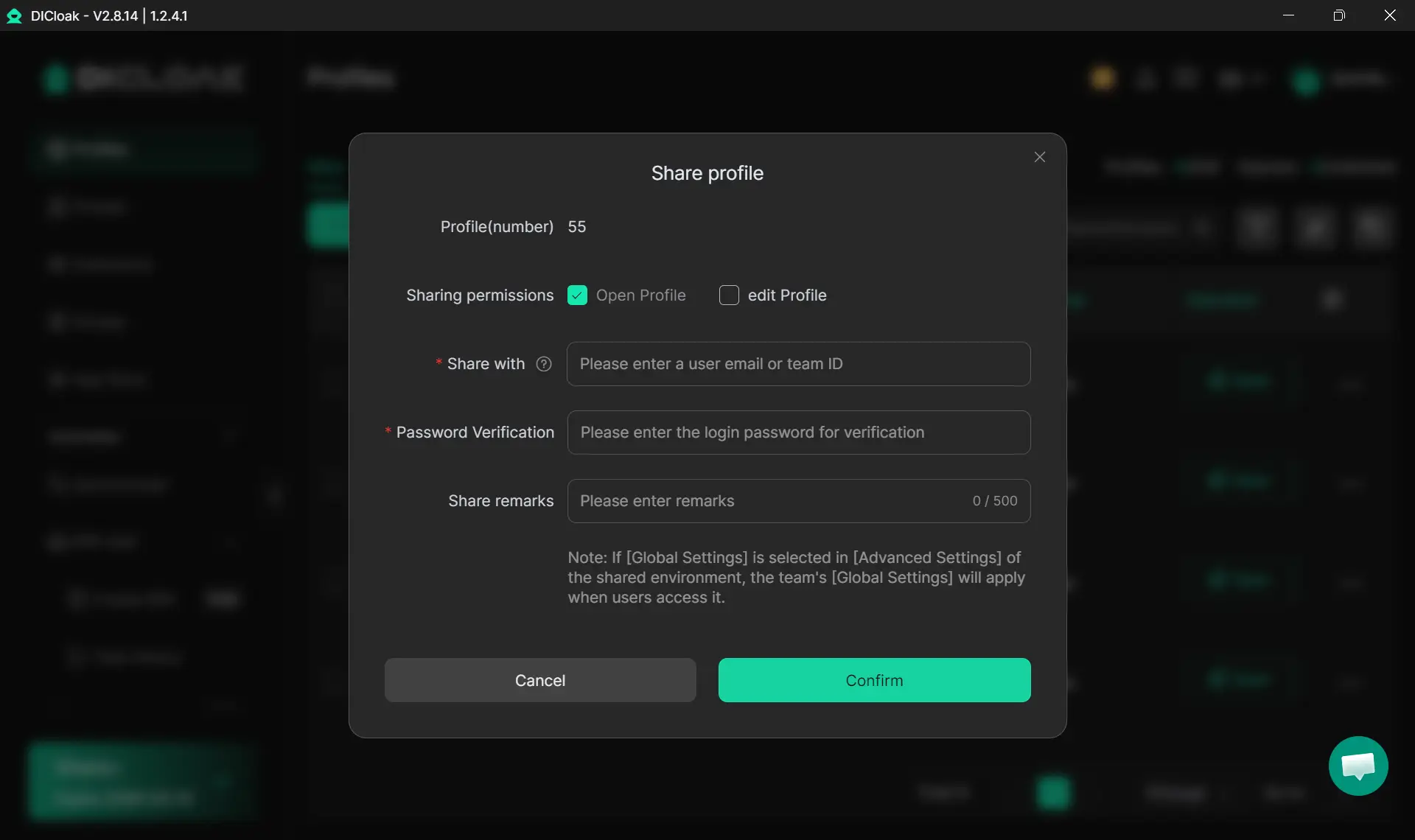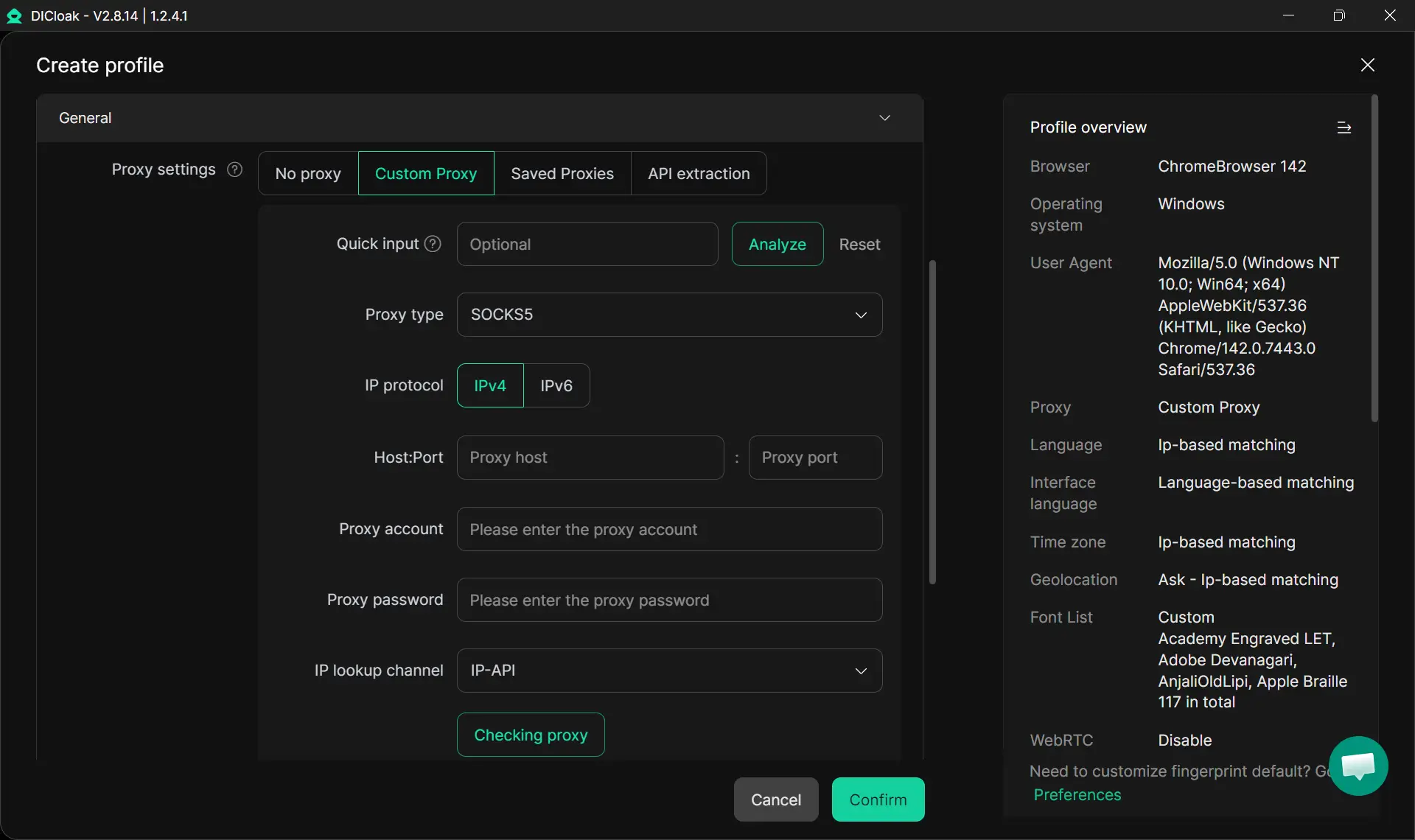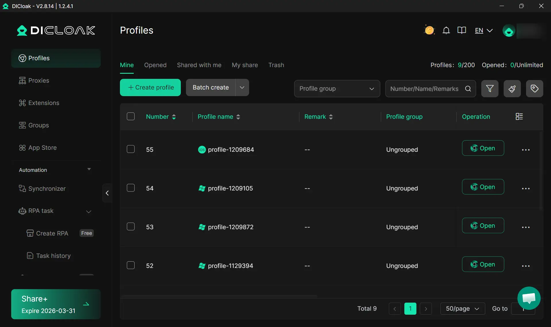DICloak phù hợp một cách tự nhiên với quy trình làm việc này. Mỗi thành viên trong nhóm có hồ sơ trình duyệt của riêng họ với dấu vân tay ổn định, duy nhất và bạn có thể ghép nối từng hồ sơ với proxy dân cư chuyên dụng để giữ cho tín hiệu địa lý nhất quán trong các phiên: