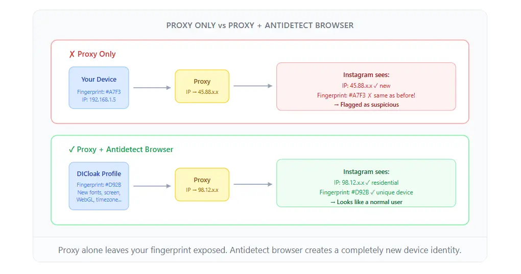 Proxy cung cấp cho bạn một địa chỉ mới. Trình duyệt chống phát hiện cung cấp cho bạn một danh tính mới. Đối với Instagram, bạn cần cả hai. Proxy giúp bạn vượt qua tường lửa mạng; cách ly dấu vân tay giúp Instagram không gắn cờ bạn khi bạn tham gia.