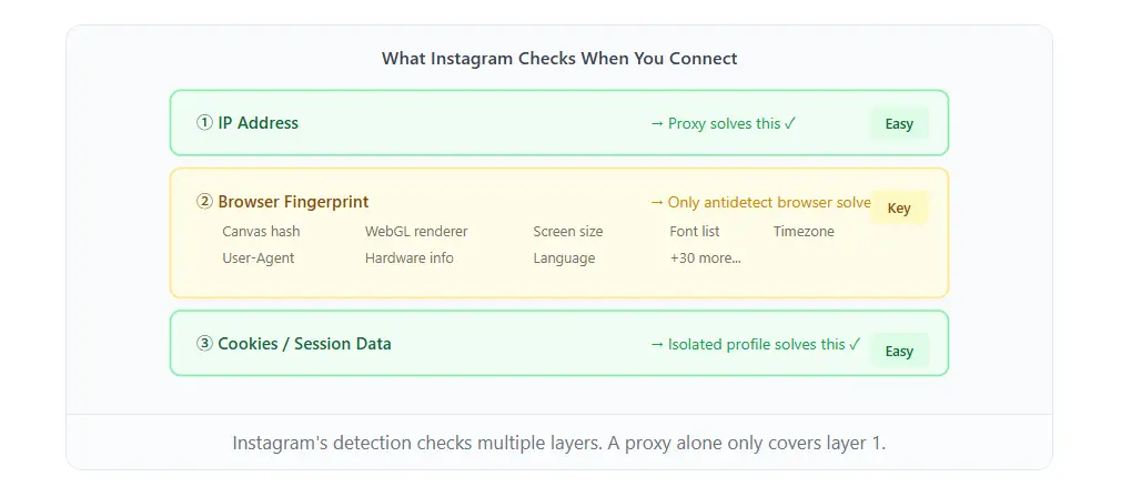Vấn đề vẫn không thay đổi: dấu vân tay trình duyệt của bạn không thay đổi. Instagram có thể thấy cùng một hàm băm Canvas, trình kết xuất WebGL, kích thước màn hình và danh sách phông chữ. Nếu tài khoản của bạn đã bị gắn cờ trước đó, thì việc kết nối qua một IP mới có cùng dấu vân tay sẽ không đặt lại cờ. Nó thực sự có thể làm cho mọi thứ tồi tệ hơn. Instagram giải thích việc thay đổi IP + cùng một dấu vân tay là một nỗ lực để trốn tránh sự phát hiện.