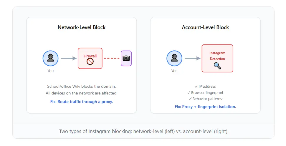 Hai vấn đề này trông khác nhau, nhưng chúng có chung nguyên nhân gốc rễ: kết nối của bạn đang bị xác định và hạn chế. Tường lửa mạng chặn Instagram bằng cách lọc IP và tên miền. Nền tảng riêng của Instagram chặn tài khoản bằng cách đọc địa chỉ IP, dấu vân tay của thiết bị và các mẫu hành vi.
