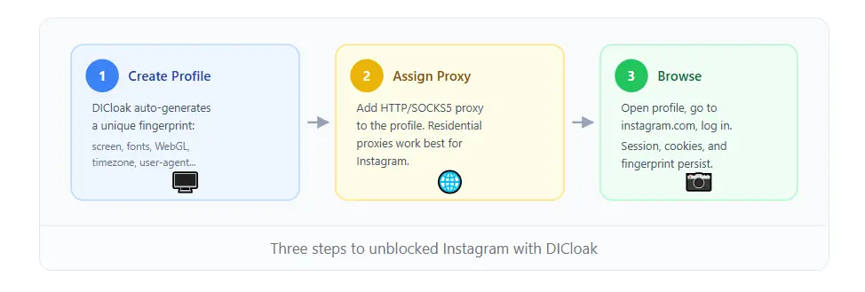 DICloak là một trình duyệt chống phát hiện xử lý việc tạo dấu vân tay và quản lý proxy trong một giao diện duy nhất. Dưới đây là cách thiết lập để bỏ chặn quyền truy cập Instagram: