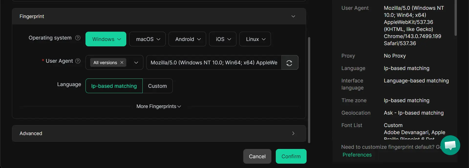 | Vân tay trình duyệt | Thực / Không bị cô lập | Tùy chỉnh & giả mạo |