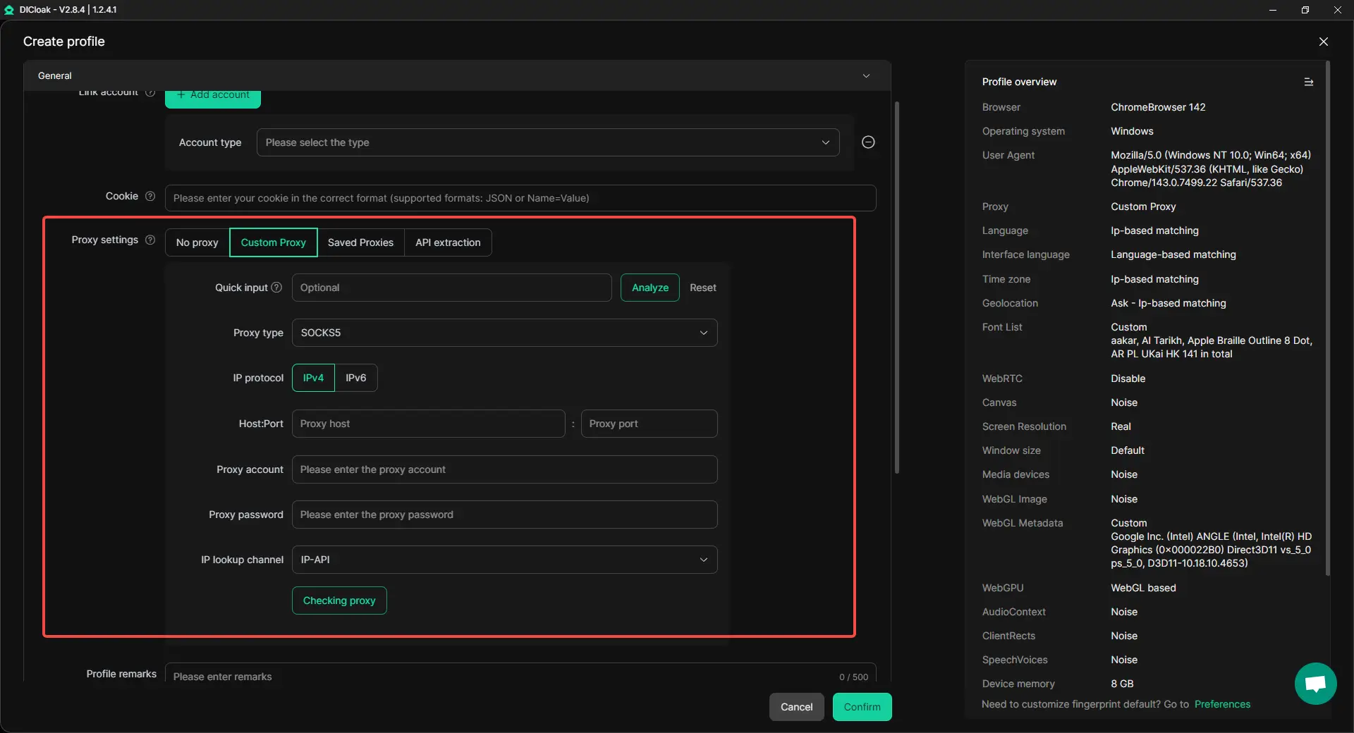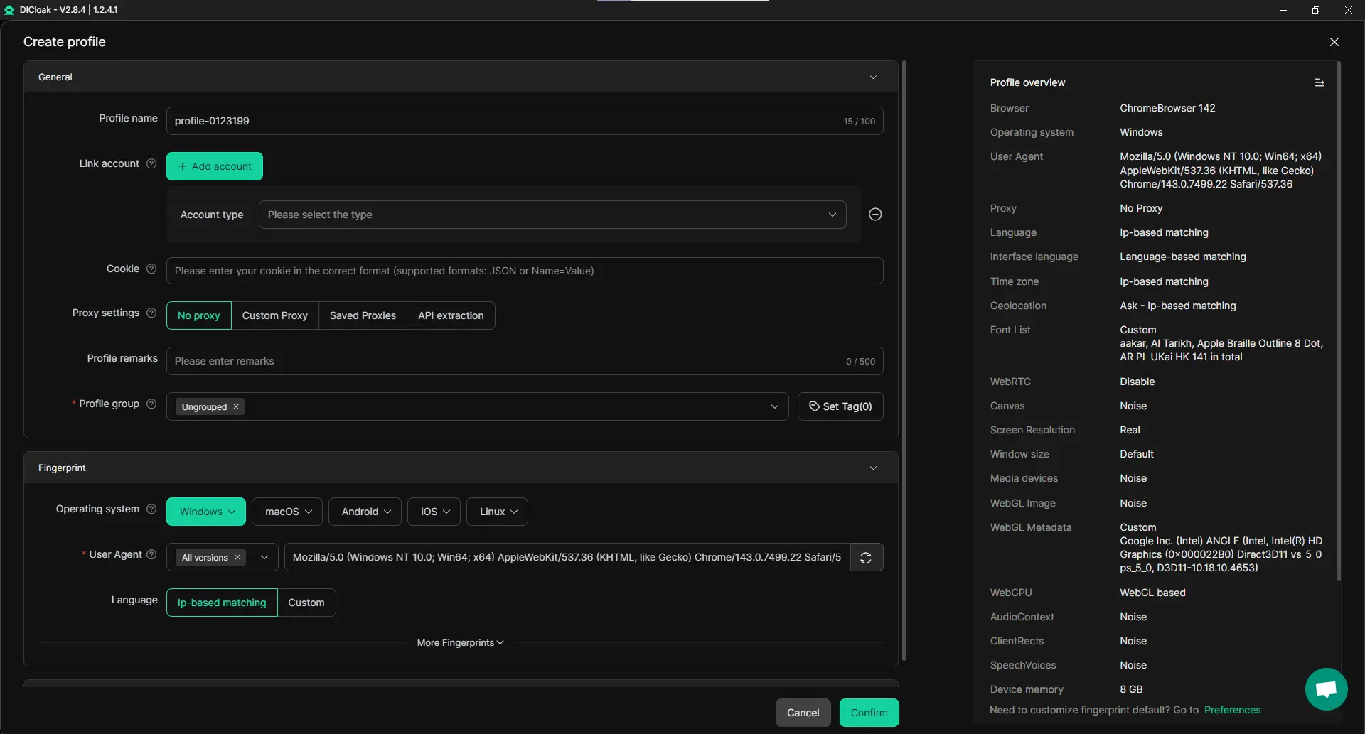 DICloak tạo các cấu hình trình duyệt biệt lập hoàn toàn tách biệt với máy tính chính của bạn. Nó không chỉ ẩn IP của bạn; nó giả mạo dữ liệu kỹ thuật nâng cao như WebGL, WebGPU, AudioContext và Cookie. Điều này khiến trình theo dõi không thể liên kết hoạt động của bạn trở lại danh tính thực của bạn.