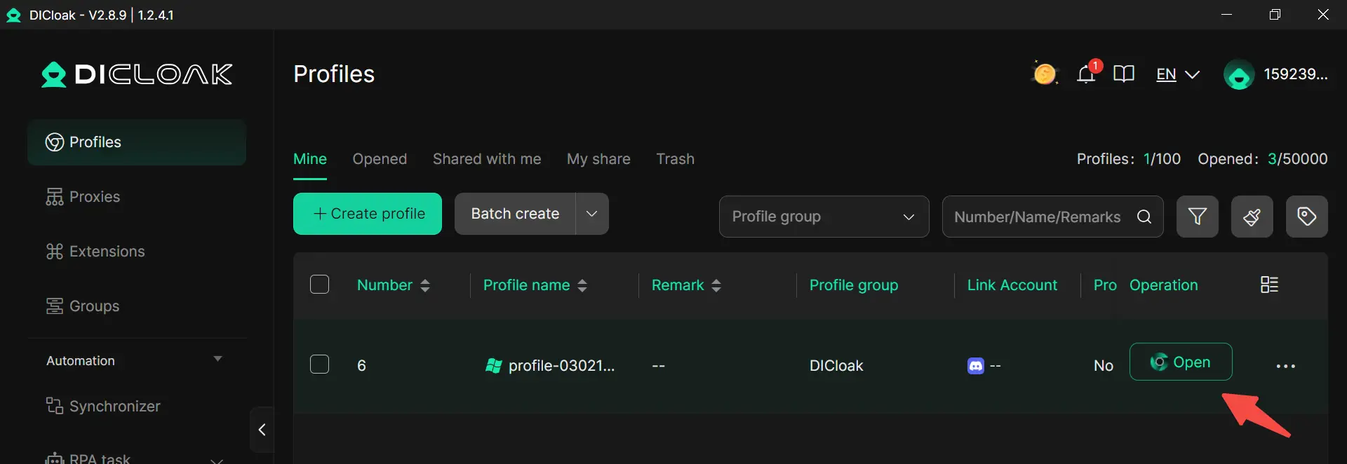 Hồ sơ mới của bạn bây giờ sẽ hiển thị trên bảng điều khiển. Nhấp vào Mở sẽ khởi chạy phiên bản trình duyệt DICloak. Nó hoạt động giống như các trình duyệt bạn đã quen, có nghĩa là bạn có thể nhập dấu trang, thiết lập tiện ích mở rộng và quan trọng nhất là đăng nhập vào tài khoản. Dấu vân tay của cấu hình là duy nhất, độc lập với thông số kỹ thuật phần cứng thực của thiết bị của bạn.